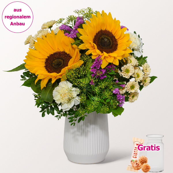 Strahlender Blumenstrauß mit Sonnenblumen, gelben Dill, lachsfarbenen Santini, pinken Statice, hellgelben Nelken, Pistochia und Salal. Durchmesser ca. 30 cm. Frisch für Dich zusammengestellt, mit Pflegetipps, Blumennahrung und Wasser versorgt.