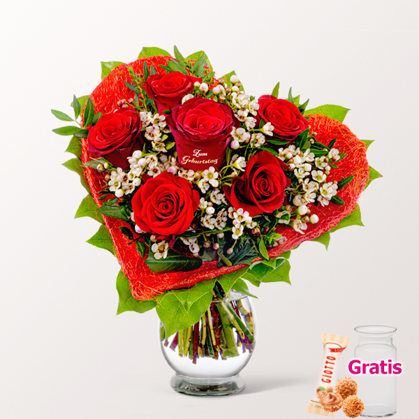 Großartiges Rosenherz mit roter Rose mit Golddruck „Zum Geburtstag“, roten Rosen, Wachsblumen, Pistochia, roter Sisalmanschette und Salal. Durchmesser ca. 30 cm. Frisch für Dich zusammengestellt, mit Pflegetipps, Blumennahrung und Wasser versorgt.